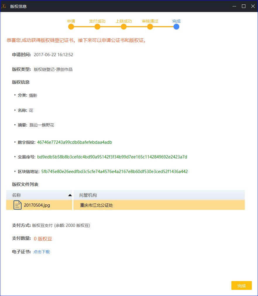 上传作品后,作者还可以在线申请公证书和版权证,如果发生纠纷需要维权,随时可以取证。这给作者维权带来了极大的方便。不仅如此,版权链目前还正在开发版权交易功能。