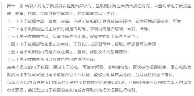 《规定》共23条,规定了互联网法院的管辖范围、上诉机制和诉讼平台建设要求,明确了身份认证、立案、应诉、举证、庭审、送达、签名、归档等在线诉讼规则。《规定》亮点颇多,其中第11条首次确立了电子数据证据的审查原则。原文如下: